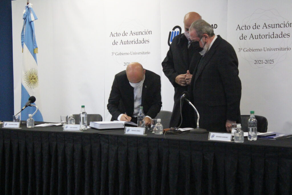 Junto a las autoridades electas, encabezaron el acto de asunción el Prof. Manuel Gómez, vicerrector saliente, y el Lic. Estaban Sanchez, Secretario de la Asamblea Universitaria.
