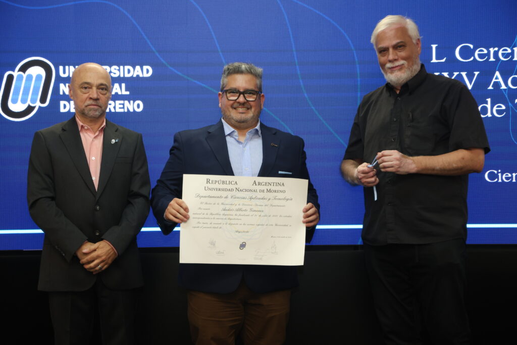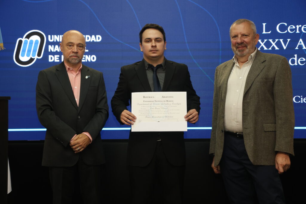 Además, en representación de sus compañeros y compañeras, habló el flamante Licenciado en Gestión Ambiental, Ignacio Ariel Gayraud Nicora: “Comencé a cursar en 2020, en pleno aislamiento por la pandemia de covid-19, por lo que para mí, la representación de la UNM era una computadora, una pantalla, el campus virtual. Cuando pudimos comenzar a cursar de manera presencial pude entender lo que era estudiar en la universidad, porque no es solo venir a cursar una materia, es también un espacio para crecer, compartir y desarrollarnos como persona. Son los debates en clase, las charlas en un pasillo, lo que hacen la diferencia en la forma de transitar la universidad. Hoy puedo decir que fui testigo de todo el esfuerzo y la dedicación que realizan los docentes y el personal de la institución. Hoy quiero agradecer todo ese trabajo, porque permitió que hoy estemos acá”.